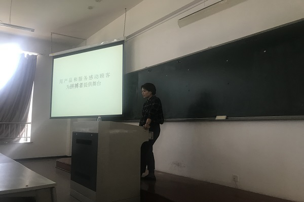 招聘会上,李旭首先以一段视频让员工们了解到好利来的企业文化以及价值观—一个成功的公司是用爱来经营的。接着,她给同学们分享了公司中优秀人才的事例并结合自身的经历向我们展示了加入企业发展后的生活。最后她对招聘岗位、岗位待遇及企业生活环境等方面做了详细的介绍。
