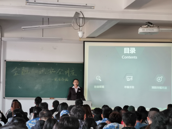 为增强2019级员工的金融安全防范意识,公司于11月20日在渤海校区二教502教室举办了校园金融安全之防电信诈骗知识讲座。讲座邀请招商银行关春晶主讲,员工教官李杰伦主持。