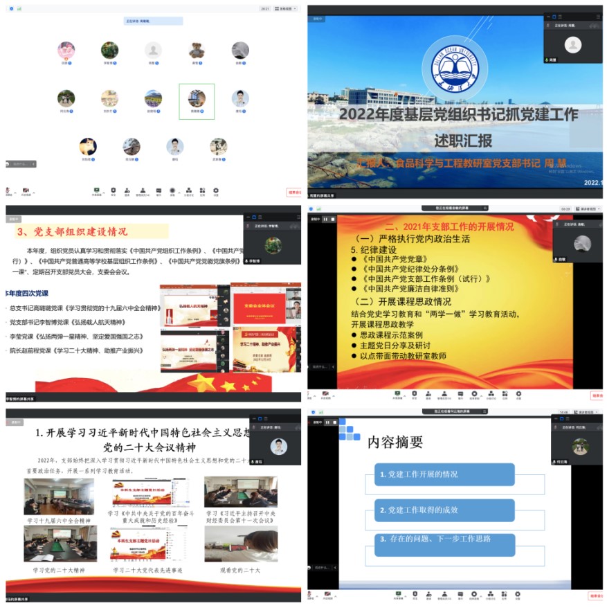 会上,食品科学与工程教研室党支部、食品质量与安全教研室党支部、海洋资源开发技术教研室党支部、研究生党支部和本科生党支部共5名党支部书记围绕全年党建工作开展情况、取得的成效和存在的问题、下一步工作思路进行现场述职。
