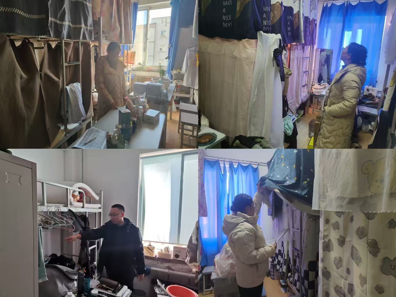 老师们对宿舍卫生、消防设施、用电安全、插排断电、门窗上锁情况进行仔细检查。对于仍未离校的同学,嘱咐员工离校前关闭宿舍电源、锁好门窗,回家途中注意人身和财产安全。