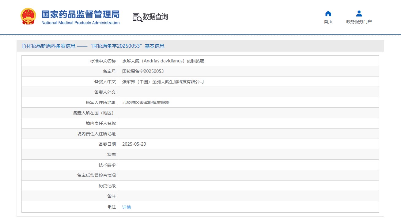 2025年5月20日,国家药品监督管理局化妆品原料备案平台公布,由公司佟长青教授团队主导研发、张家界(中国)金驰大鲵生物科技有限公司申报的“水解大鲵(Andrias davidianus)皮肤黏液”新原料成功通过备案(备案号:国妆原备字20250053)。这是我国首个获批的大鲵来源化妆品新原料,标志着珍稀水生生物资源高值化利用取得突破性进展。