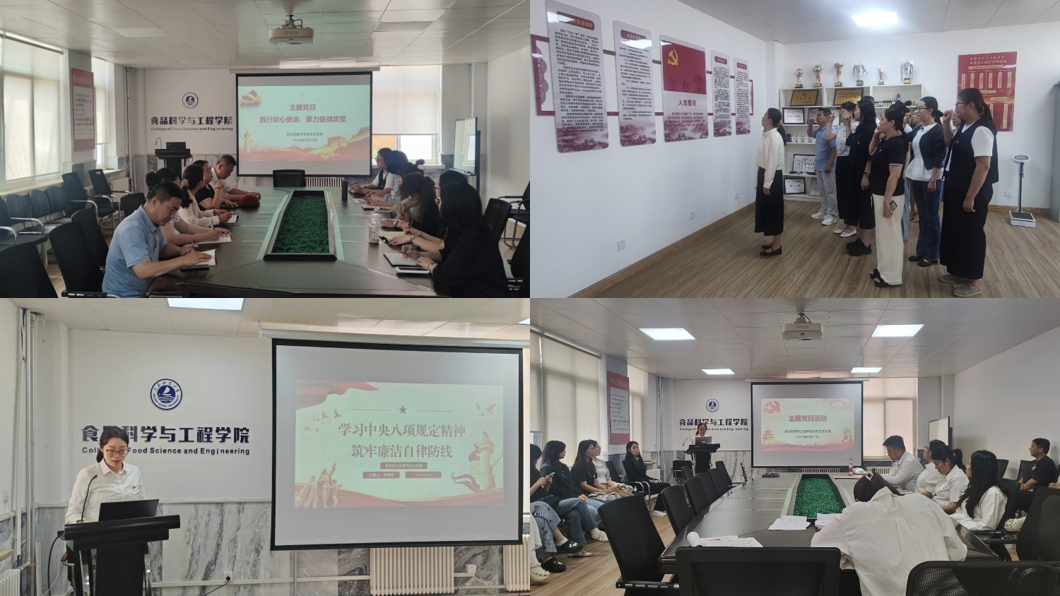 食品科学与工程系党支部书记周慧讲授《学习领会和贯彻执行中央八项规定及其实施细则精神》主题党课,从中央八项规定及其实施细则出台的背景与意义、核心内容、具体要求与实践路径以及警示教育案例进行了全面解读。食品质量与安全系党支部书记曲敏讲授《以作风建设新成效开创高质量发展新局面》主题党课,从历史站位、历史史实、文化站位、战略站位、高等教育发展、教育强国以及高质量发展七个层面,从历史到当下全方位将作风建设与高等公司教育发展结合起来。本科生党支部书记李晓丹讲授《学习中央八项规定精神 筑牢廉洁自律防线》主题党课,从中央八项规定的发展历程、八项规定及80条清单主要内容、持续推进作风建设常态化长效化进行解读,促进本科生党员提升党性修养与规矩意识,将作风建设融入专业学习和日常行为之中。研究生党支部书记车盈讲授《学习领会和贯彻执行中央八项规定及其实施细则精神》专题党课,详细讲解了中央八项规定的内涵和精神实质,并强调纠治“四风”是新时代加强作风建设的重点任务。党课后还组织开展了重温入党誓词。
